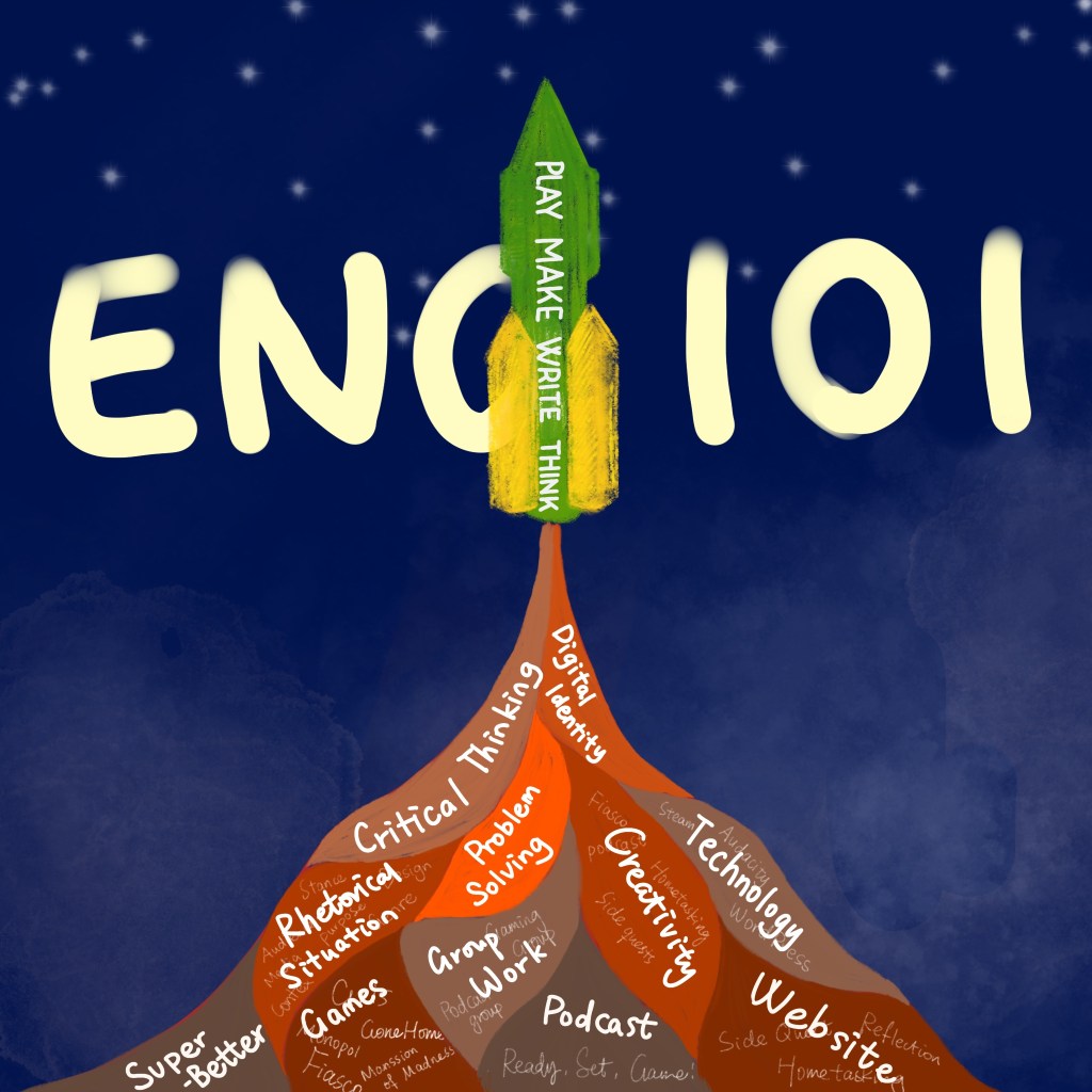 The design of my assembly is a rocket flying high to the sky. I include the contents that we have learned in this class in the rocket trail, symboling the accumulative skills and experience that are pushing us forward. On the fundamental layer, there is the materials of ENG 101 class: the book SuperBetter we read, the games like Fiasco we played and discussed, the three podcasts we produced in a group, and the website we designed to post our thoughts. In the upper layer, there is the skills we practiced: analyzing rhetorical situations, working in a group, creating interesting posts, and embracing technology as a new media to write. At the top of the trail is the ability we possess after finishing this class: critical thinking, problem-solving, and digital-identity exploring.